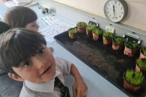 As part of their World Around Us topic of In the Garden the P1 boys have been looking at plants. So far we have planted runner beans and used grass seeds to grow funky new hairstyles. The boys also had great fun tasting different parts of plants.