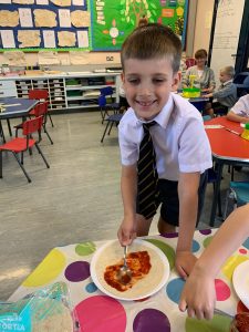 As part of their WAU topic of Pirates P2 wrote their very own pizza recipes using time connectives and bossy verbs. The recipes looked so good that Mr Morrow just had to let the boys have a go and make them!